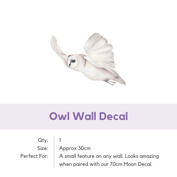 Our 55cm or 30cm Owls make a enchanting addition to any room! Use the 30cm owl for a small feature or the 55cm Owl looks incredible flying through the night sky and paired with our 70cm Moon Decal.