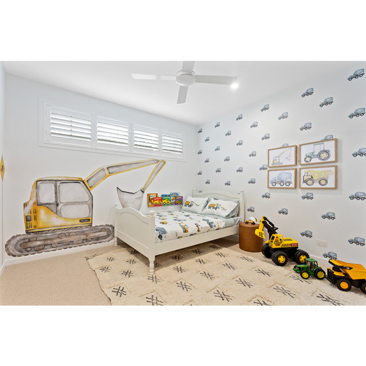 - Mini 3/4 Pack: 32 Mini Mixed Construction Vehicles - intended to cover 3/4 wall (based off standard wall 2.4 high-3m wide however, could do full wall with larger spacing.