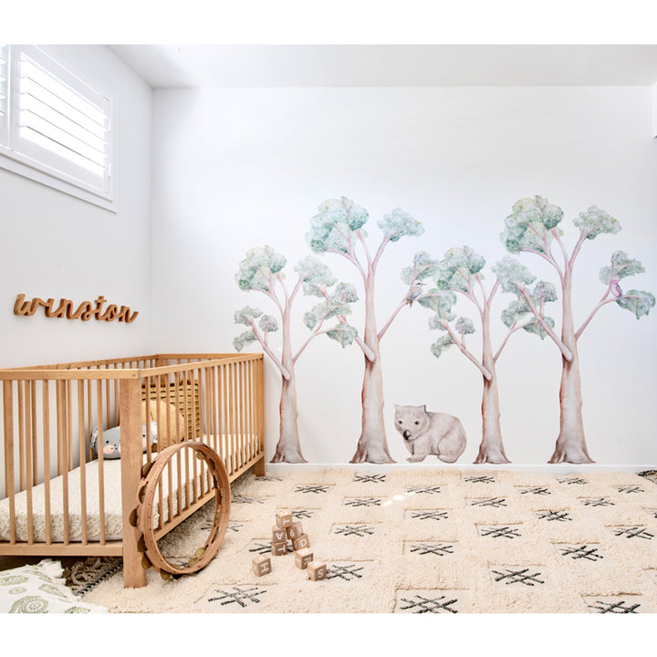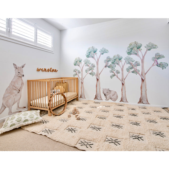 Value Pack 3: 2 x Medium 150cm Gum Trees, 2 x Large 185cm Gum Trees, 1 x Mini 20cm Kookaburra (as styled in nursery photo),1 x Mini 20cm Galah (as styled in nursery photo)
